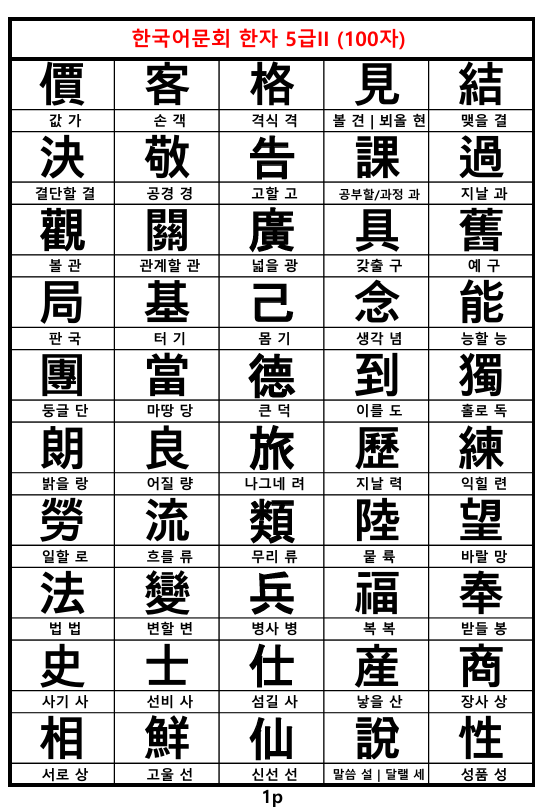 한국어문회 준 5급 한자표