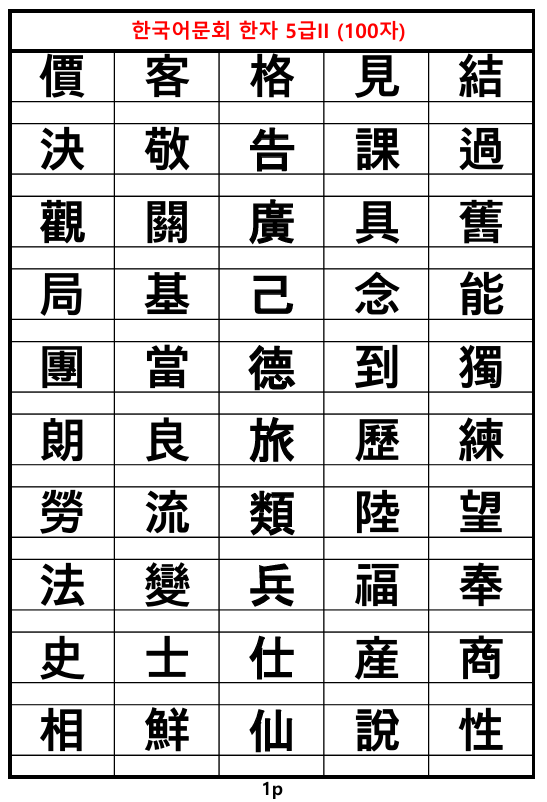 한국어문회 한자능력검정시험 준 5급 한자표입니다. 뜻 음 쓰기 한자 쓰기까지 포함되어 있습니다.
